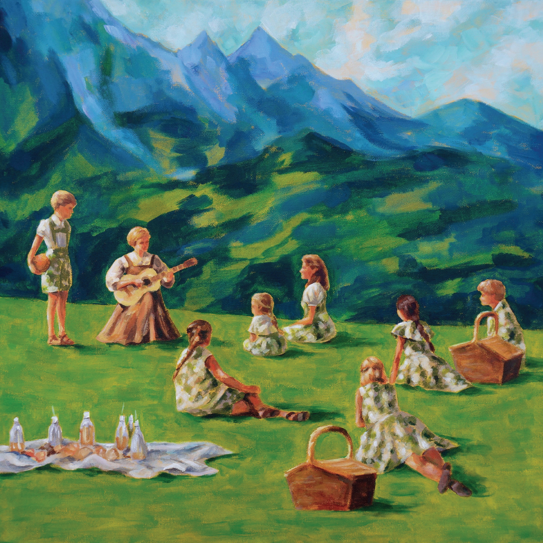 Acrylic painting of the lovely scene from the Sound of Music where Maria and the children relax and sing on the hilltop among the mountains. There was a focus on color and loose, gestural brushstrokes rather than detail to capture the likeness of the scene.